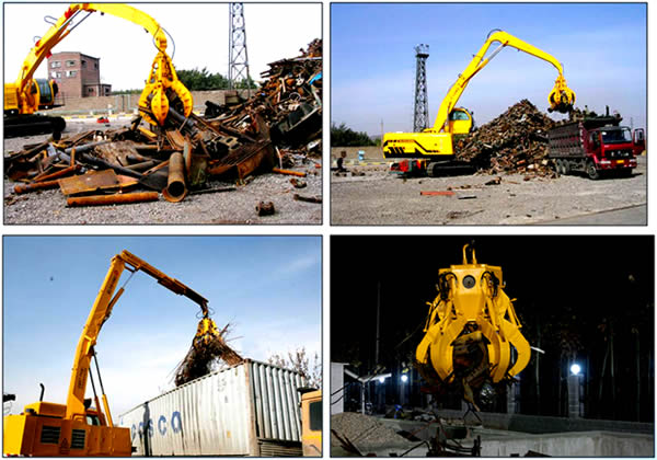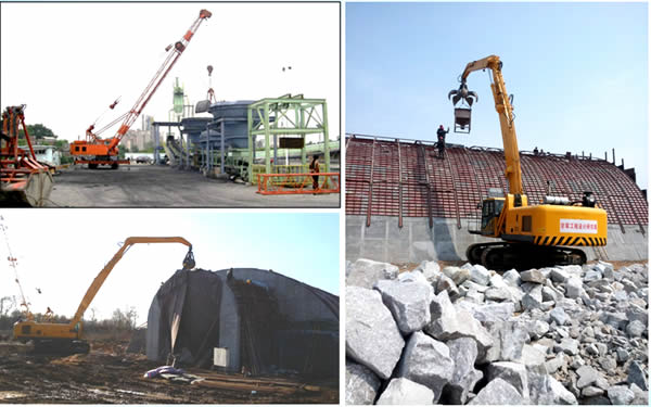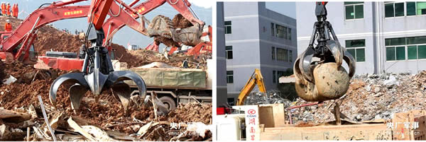 八達(dá)重工抓料機(jī)在實(shí)施救援清理作業(yè),右圖為剝離出一只大型煤氣瓶。