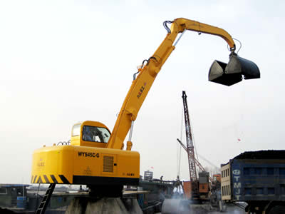 WYS42C-G型電動液壓固定式疊臂抓料機的回轉、卷揚、變幅及抓斗開閉作業(yè)等全部采用電動液壓驅動,先導控制。具有作業(yè)平穩(wěn)、各動作可無級調(diào)速;同等作業(yè)效率下可比內(nèi)燃機驅動節(jié)省60%能耗;司機室安裝冷暖兩用空調(diào)、多向調(diào)節(jié)座椅,作業(yè)環(huán)境舒適;配裝不同的液壓抓斗后均有自重小、抓取力大,對沙石、煤等散裝原料進行抓取作業(yè)。